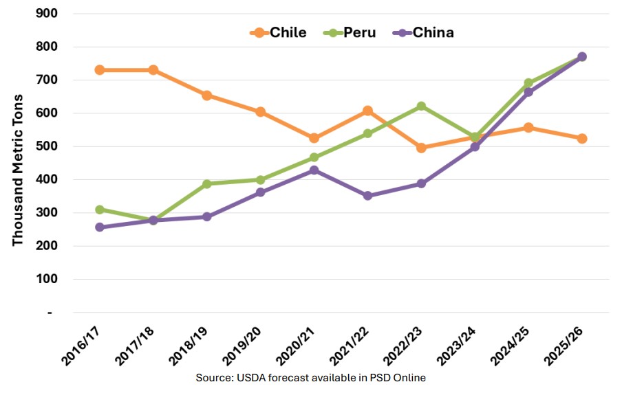 China’s table grape exports during the 2025/26 marketing year are projected to increase by 16% to 770,000 metric tons. If realized, this would represent another step forward after China surpassed Chile last year, making China, for the first time, the world’s joint-largest fresh table grape exporter alongside Peru, whose table grape exports for 2025/26 are also estimated at 770,000 metric tons.