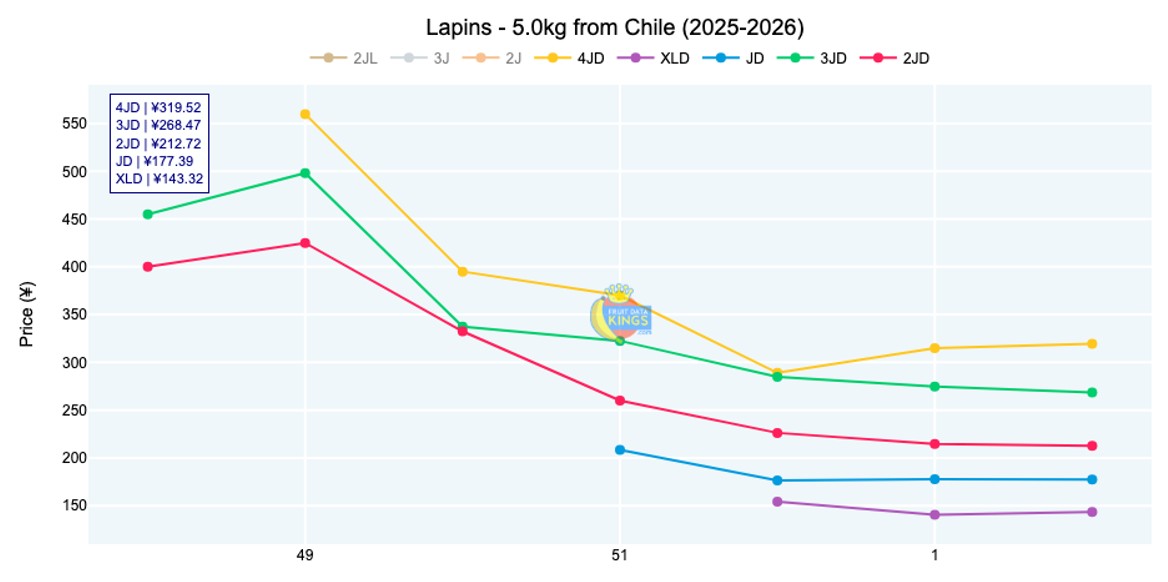 New Zealand cherries have been delayed due to cold, as Chilean goods control the market. The first notable influxes of Kordia and Regina were received during week 2, with market pricing similar to that of last year. For Kordia and Regina, the size-based price difference was enormous, with as much as a ¥300 difference between XLD and 3JD. This was not as visible for Santina or Lapins, which had a difference of about ¥150 between XLD and 4JD. One would expect that the price range between these goods will move closer together as more Kordia and Regina become available. At the retail level, pricing declined to average ¥79.00 (1 kg), which is 19% lower compared with the same week of last season. In addition, 2.5-kilogram gift packs account for a dominant share of retailer offers. View market data.