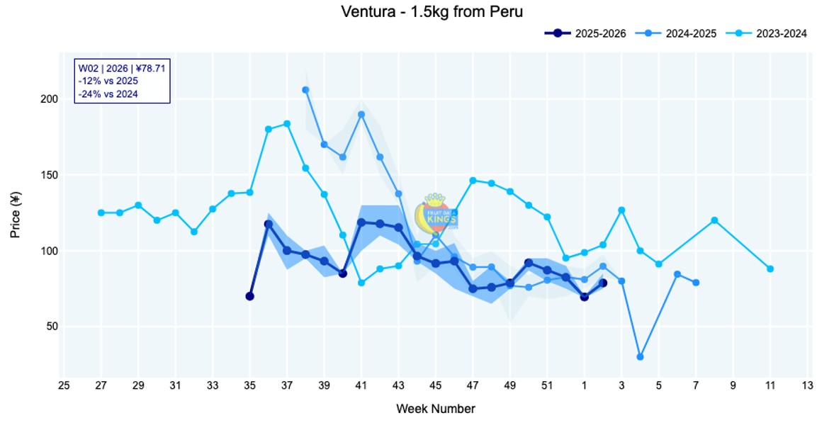 Wholesale pricing for imported blueberries increased this week by around 12% or ¥10 per carton on most sound-quality openings. Peruvian imports still hold the dominant position, but over the last two weeks Chile has accounted for about 20% of recorded openings. Similar to Peru, Chilean blueberries are priced below the previous two seasons, with Duke between ¥65 and ¥75 (1.5 kg) and Suziblue priced similarly. Peruvian Magica and Ventura are both approximately 15% lower in price than the same week of last year. For full market details, visit our website. View market data.