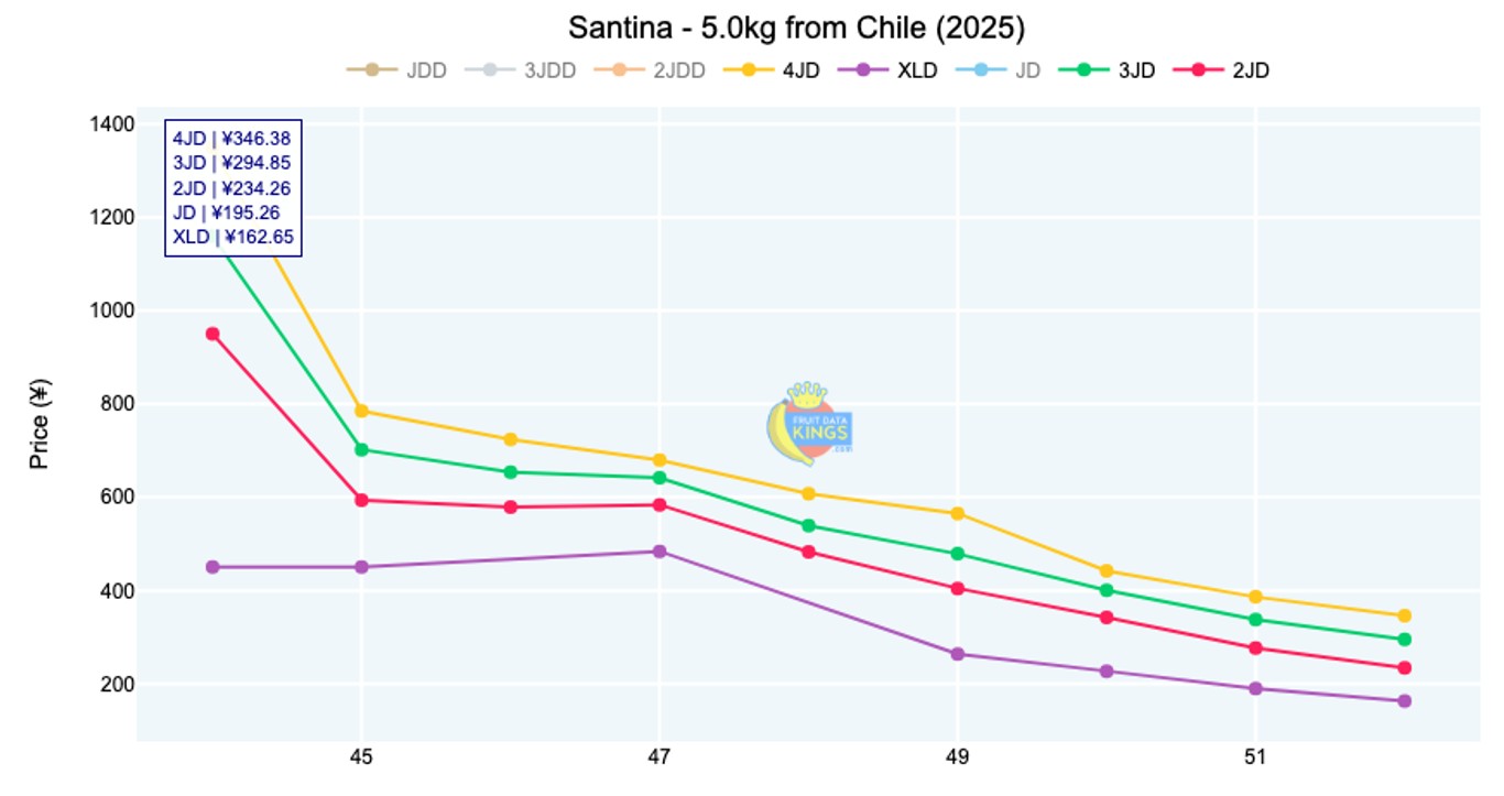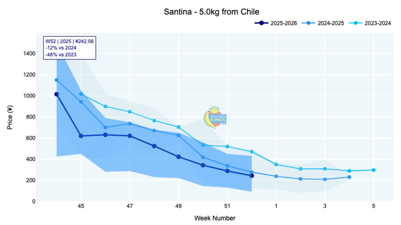 The first plums from Chile have arrived, with a very well known brand featuring in the market. Candy Pixie opened at around ¥380 for 4J (2.5 kg) and ¥430 for 5J (2.5 kg). Fruit Data Kings will be monitoring Chilean plums as we enter into 2026. View market data.