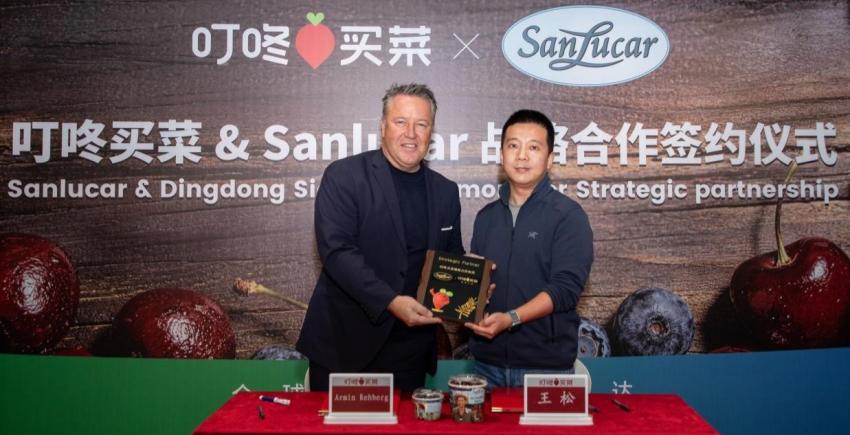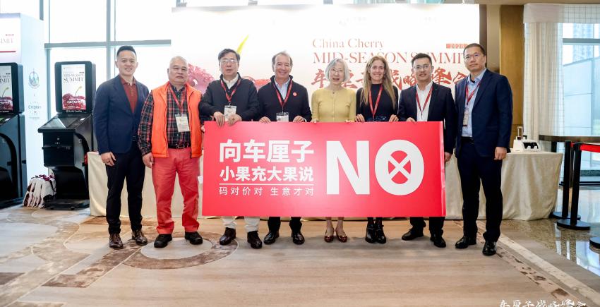 Yu Lu, vice president of CFNA; Xu Zheng, general manager of Jiaxing Haiguangxing Market Management Co. Ltd.; Zheng Nanshen, general manager of Guangzhou Jiangnonghui Market Service Management Co. Ltd.; representative of the Cherry Professional Committee of CFNA from the Chair Unit, Joy Wing Mau Group; representative from the Vice-Chair Units, Jinguo Trading Co. Ltd./Frutacloud Supply Chain; representative from the Vice-Chair Unit, Riverking (Shanghai) Agricultural Technology Development Co. Ltd.; Ivan Marambio, president of Frutas de Chile; and Claudia Soler, executive director of the Chilean Cherry Committee (listed in no particular order).