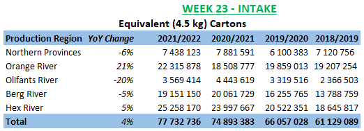 *Intake: Produce inspected and passed for export (PPECB data). Exports: Produce is seen as exported once the ship leaves South Africa’s shores (Agrihub data).