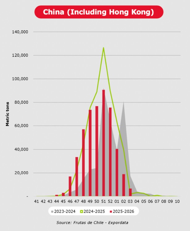 Industry sources indicate that the remaining major container arrivals of Chilean cherries are occurring this week and next (weeks 4 and 5). Estimates indicate that more than 90% of this season’s total volume has already arrived in the market. Very limited volumes of fruit are expected from week 6 onward to the Chinese New Year period, given that arrivals were concentrated earlier in the season.