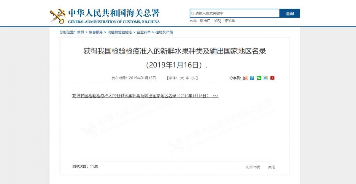 The updated list of which fresh can be exported to China was published on GAC's website, dated 16 January 2018