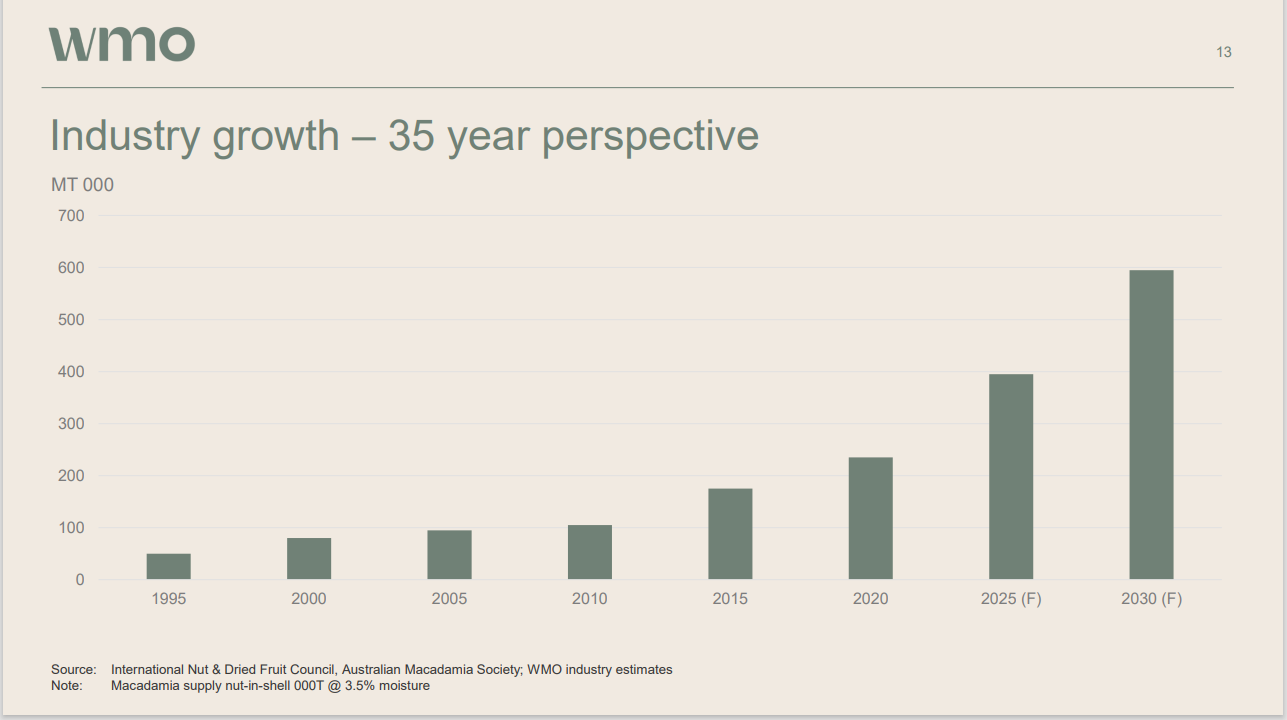 According to a recent forecast by the World Macadamia Organisation, global in-shell macadamia production is projected to approach 400,000 metric tons (3.5% moisture) by 2025, 560,000 metric tons by 2029 and nearly 600,000 metric tons by 2030. Over the next five years, the global macadamia industry is expected to maintain a rapid growth trend, with a compound annual growth rate of 10.2%.