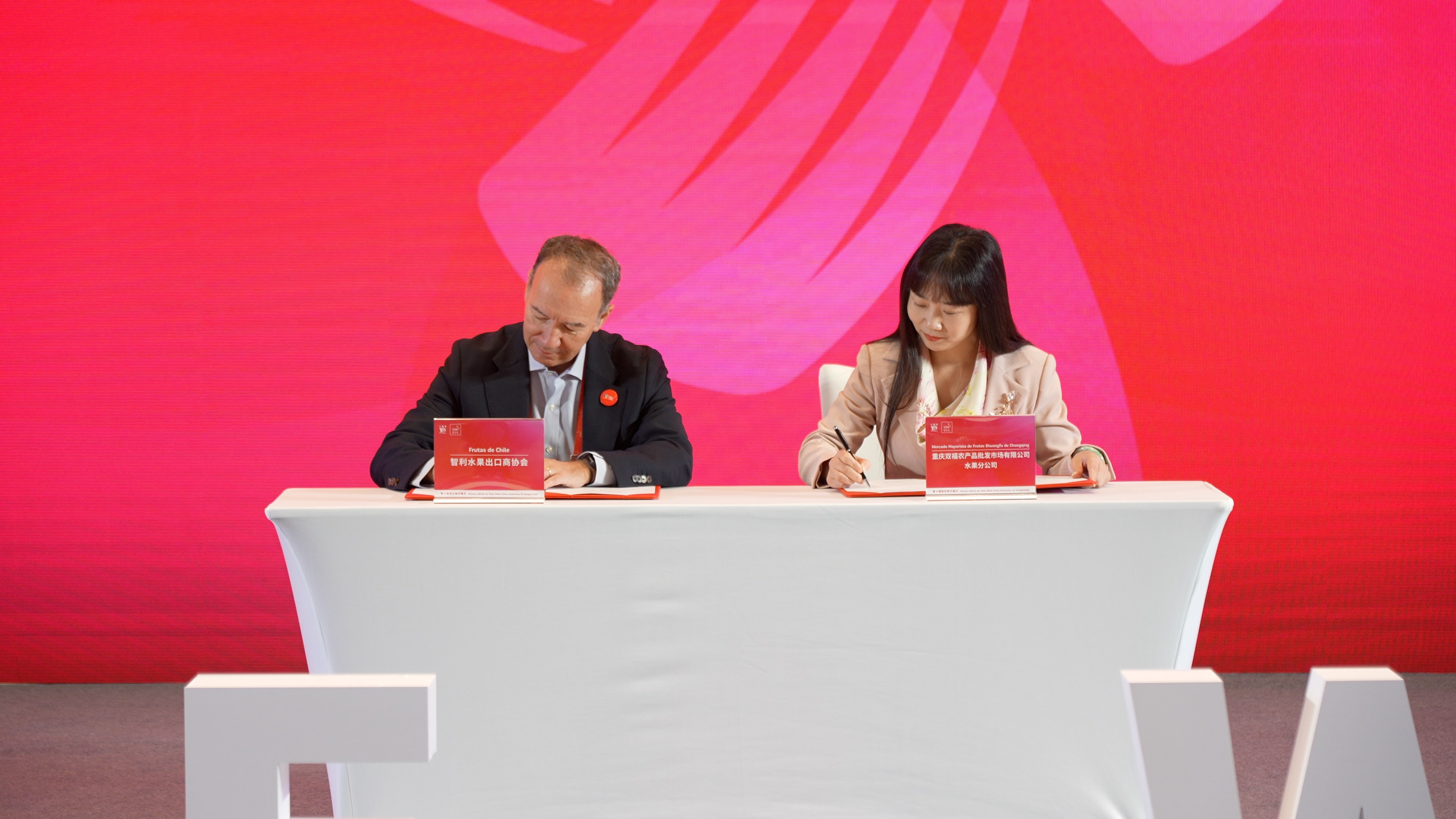 Ivan Marambio, president of Frutas de Chile, signed a memorandum of understanding with representatives from the Chongqing Shuangfu Fruit Wholesale Market. Under the agreement, the two sides will collaborate on fruit trade, strengthen commercial ties between the Chilean fruit industry and Chongqing as well as the wider southwest region, and boost the recognition of Chilean fruit among Chinese consumers and buyers. In his keynote speech, Marambio expressed his hope that Chilean cherries, using Chongqing as a gateway, will reach the entire southwestern market.