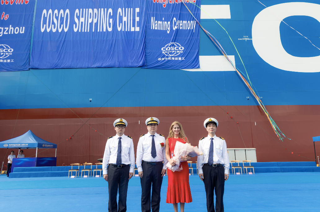 On Sept. 20, the new 14,100 TEU vessel COSCO Shipping Chile, ordered by COSCO Shipping Lines, was officially delivered and put into operation at COSCO’s shipyard in Yangzhou. Claudia Soler, executive director of the Chilean Cherry Committee of Frutas de Chile, was invited to formally name the ship, making her the first Chilean to do so for a COSCO vessel.
