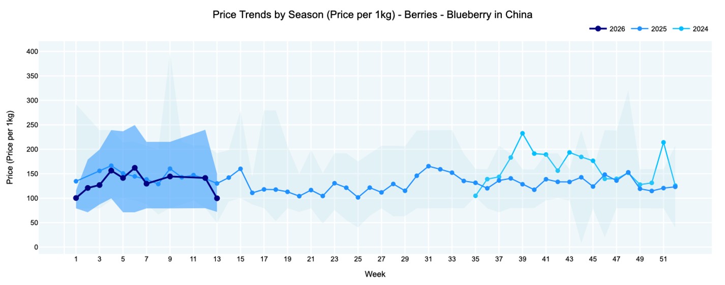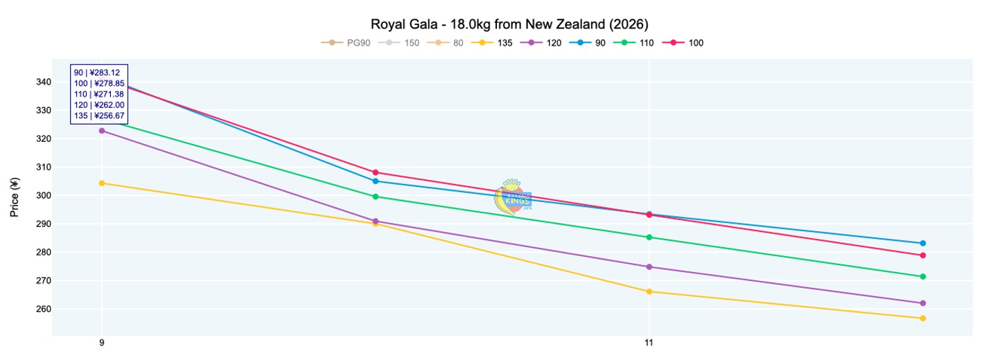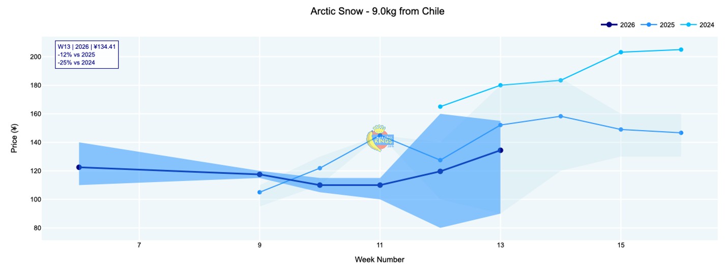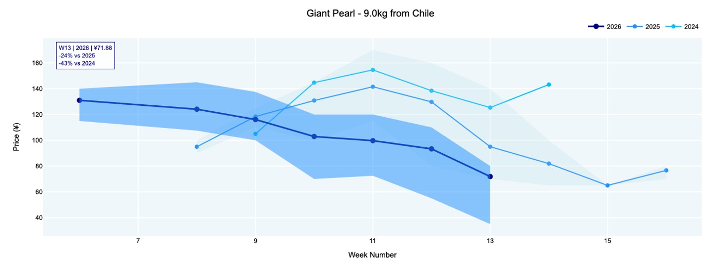 Chilean Sweet Giant held at ¥94 (9 kg, various sizes), about 10% below last year, while Arctic Snow firmed to ¥134 (9 kg, various sizes) after gaining ¥18 compared with last week. Giant Pearl slipped to ¥72 (9 kg), about 24% below 2025 levels. Full year-on-year charts, as well as price by size charts of various varieties, are available online.