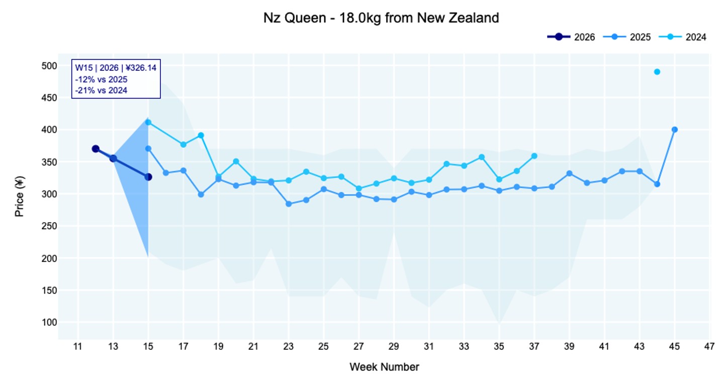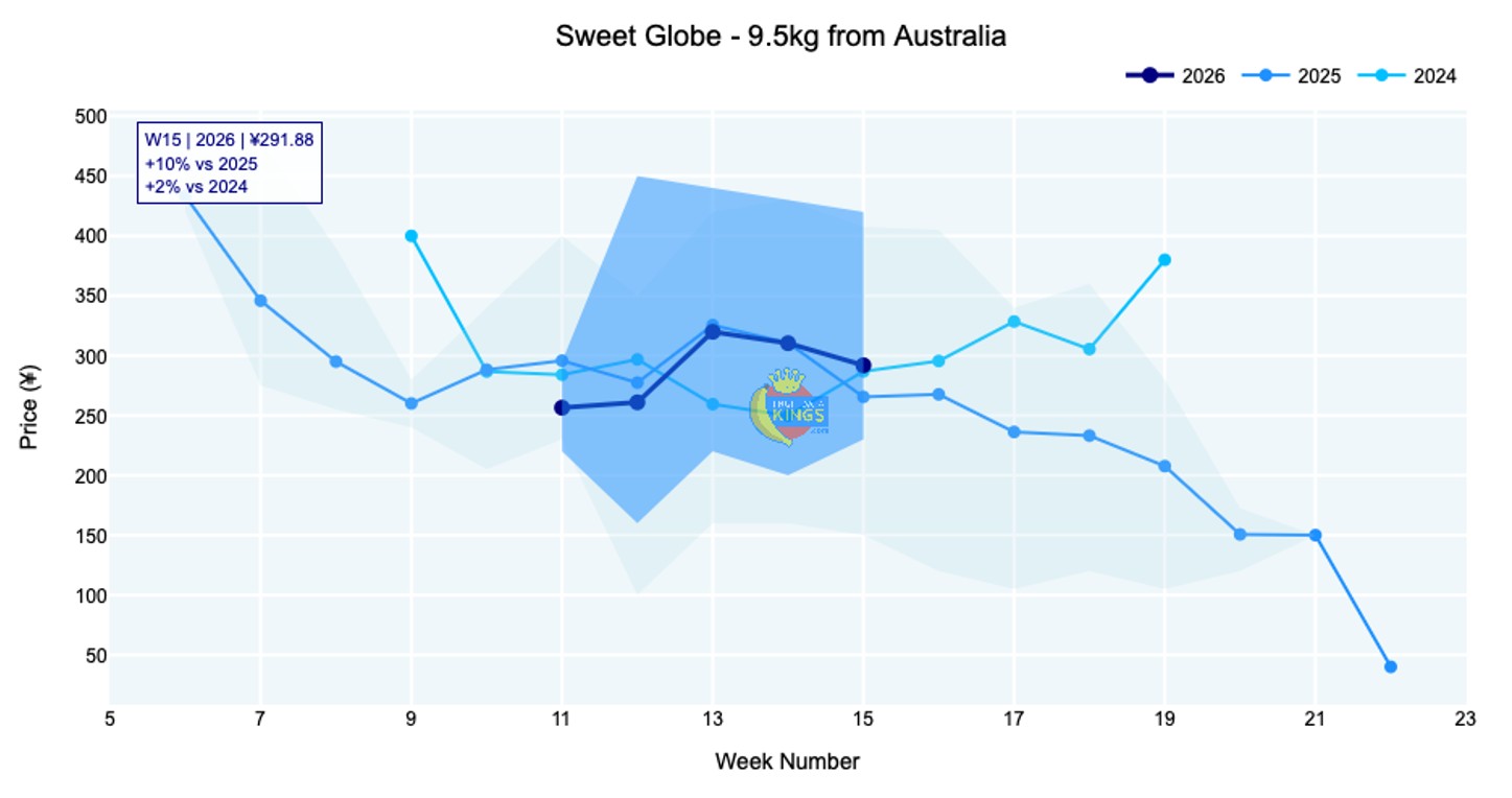 Australian Crimson held steady at ¥264 (9.5 kg), sitting comfortably above both 2025 and 2024 at 15% higher. Chilean Red Globe traded at an average of ¥179 (8.2 kg, various sizes), in line with last year though well below 2024. Sweet Globe showed a range depending on origin, with Australian 9.5-kilogram lots at ¥302 and Chilean 7.3-kilogram lots at ¥178, both broadly stable. Peruvian Sweet Globe firmed notably to ¥240 (7.3 kg). More variety, origin and retail information is available to members.