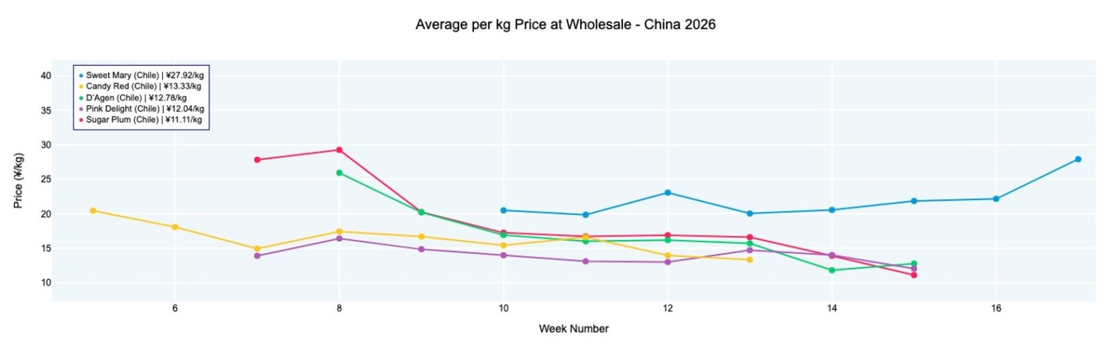 Chilean Red Globe, still the most widely recorded variety, averaged ¥162 (8.2 kg, various sizes), firming slightly compared to last week and remaining broadly in line with 2025. Australian Crimson held at ¥277 (9.5 kg), sitting about 33% above last year, while Sweet Globe from Australia was at an average of ¥274 (9.5 kg). Chilean Sweet Favors came in at ¥144 (8.2 kg). Peruvian and Chilean Sweet Globe, Autumn Royal and other varieties are also available, with full wholesale and retail details online.