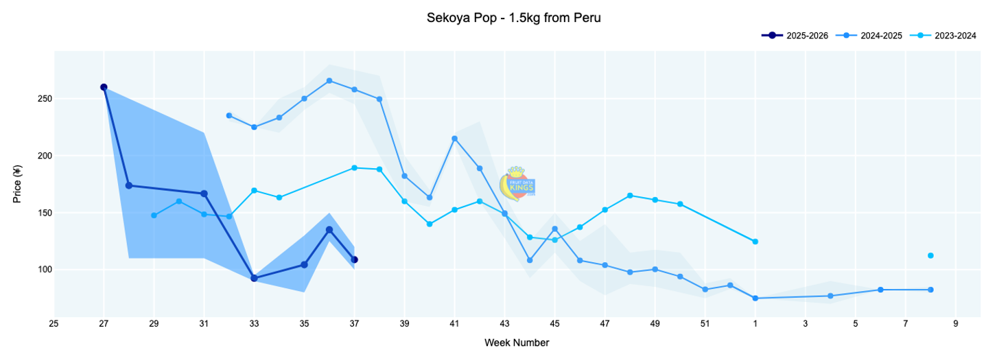 We are fast approaching the closing week of the season. New Zealand remains the most active supplier with new containers still being opened at the wholesale level. Apple pricing generally lifted this week or stayed stable. NZ Royal Gala averaged ¥309 (18 kg), up from ¥298 last week; however, they are still trading 14% below last year’s level. NZ Queen remained level compared to the previous week in a very wide price range with an average value of ¥317 (18 kg, various sizes). South African Royal Beaut also showed improvement and was trading above last year’s level by about 7%. View market data.