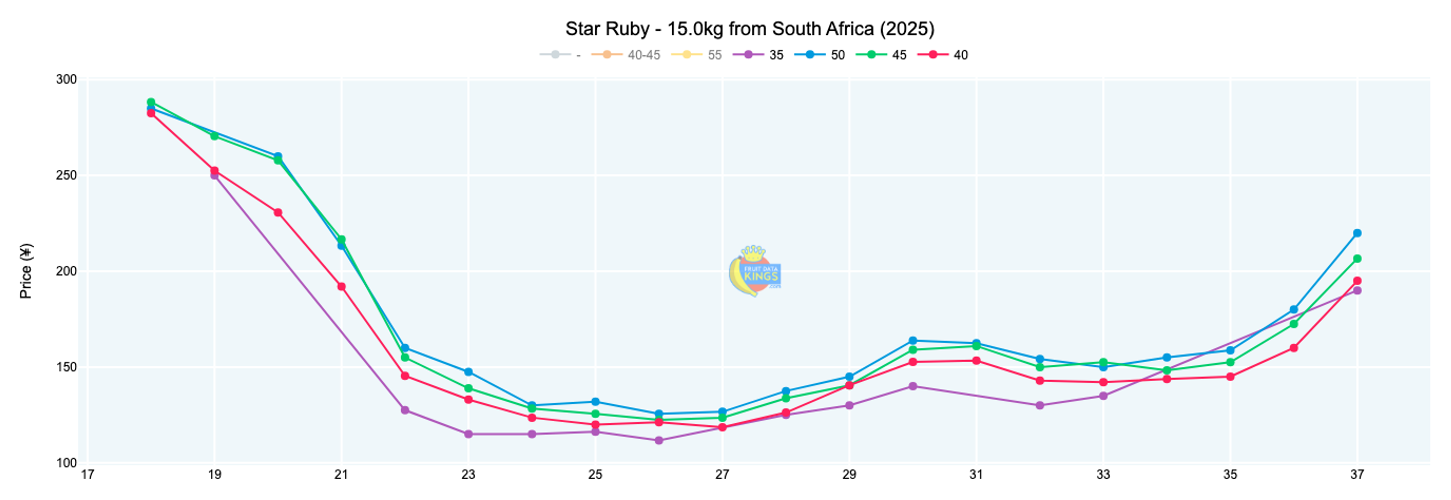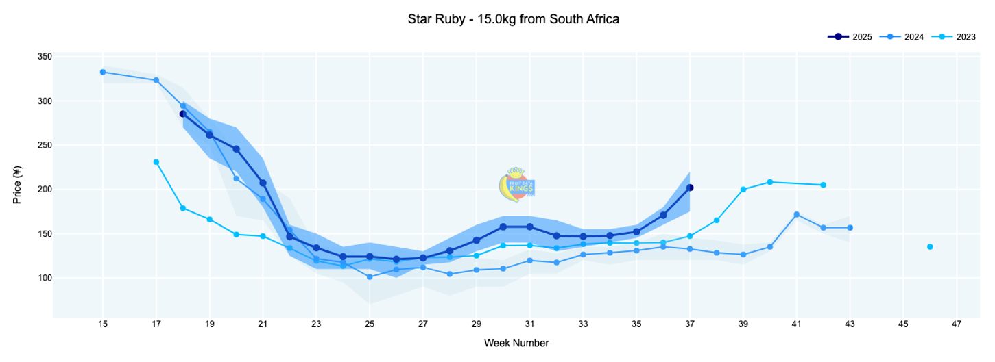 South African Star Ruby pricing strengthened to ¥202 (15 kg), up from ¥171 last week and trading 52% above last year’s levels. A much better season than in recent years! View market data.