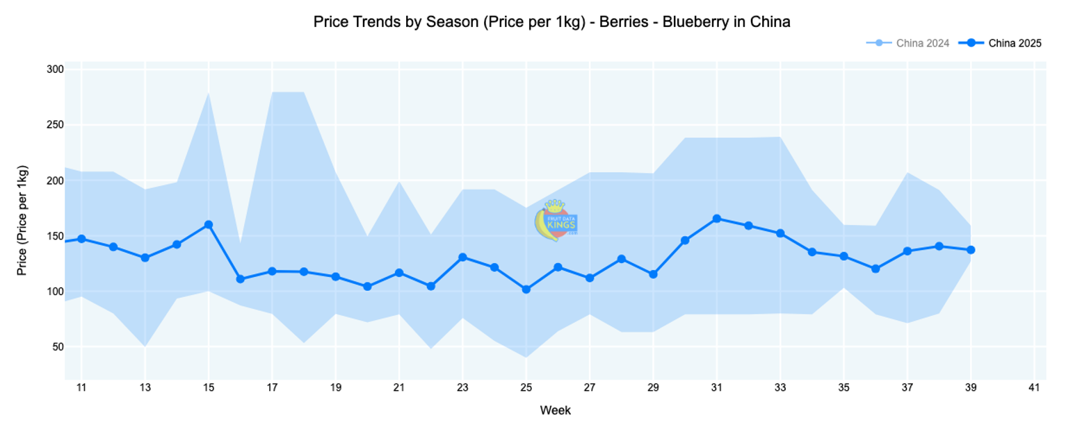 Sekoya Pop and Magica are currently the leading variety offerings. Wholesale pricing continues below the levels of the previous two seasons across all varieties. At the retail level, domestic blueberries remain very active, including those packed in worldwide brands. However, the average retail price point for Peru and China is hovering between ¥16.25 and ¥20.00 (125 g), which is 20% below what we have on record for the same week of 2024. View market data.