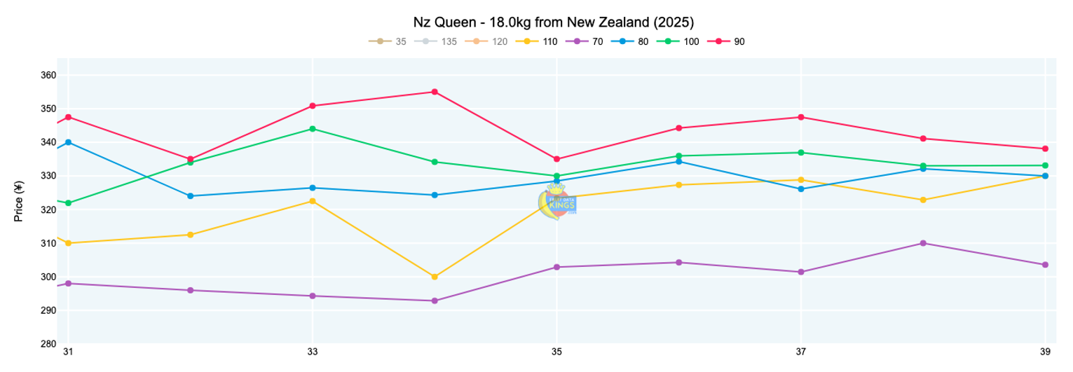 Over the last three weeks, New Zealand has continued to dominate the import segment at 78% of arrivals, with NZ Queen leading at 48% of the variety share. NZ Royal Gala prices firmed to an average value of ¥310 (18 kg), while Dazzle reached ¥406 (18 kg, various sizes). NZ Queen prices lifted to an average of ¥323 (18 kg), trading around 17% higher than 2023 but still visibly below the 2024 season. View market data.