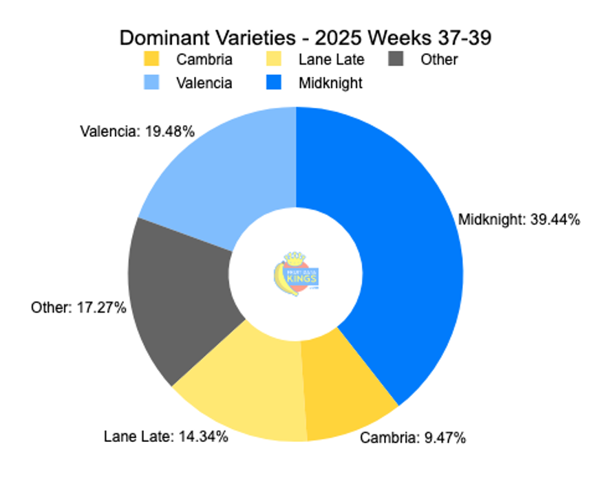 At the wholesale level, South Africa leads with more than 70% market share over the past three weeks. Valencia pricing has softened to ¥131 (15 kg), while Midknight declined to ¥140 (15 kg); these values are both in line with the previous two seasons. Australian Lane Late remained steady at ¥319 (18 kg). At the retail level, we are seeing an average value of ¥15.20 (1 kg), which is lower than the same week of last year. View market data.