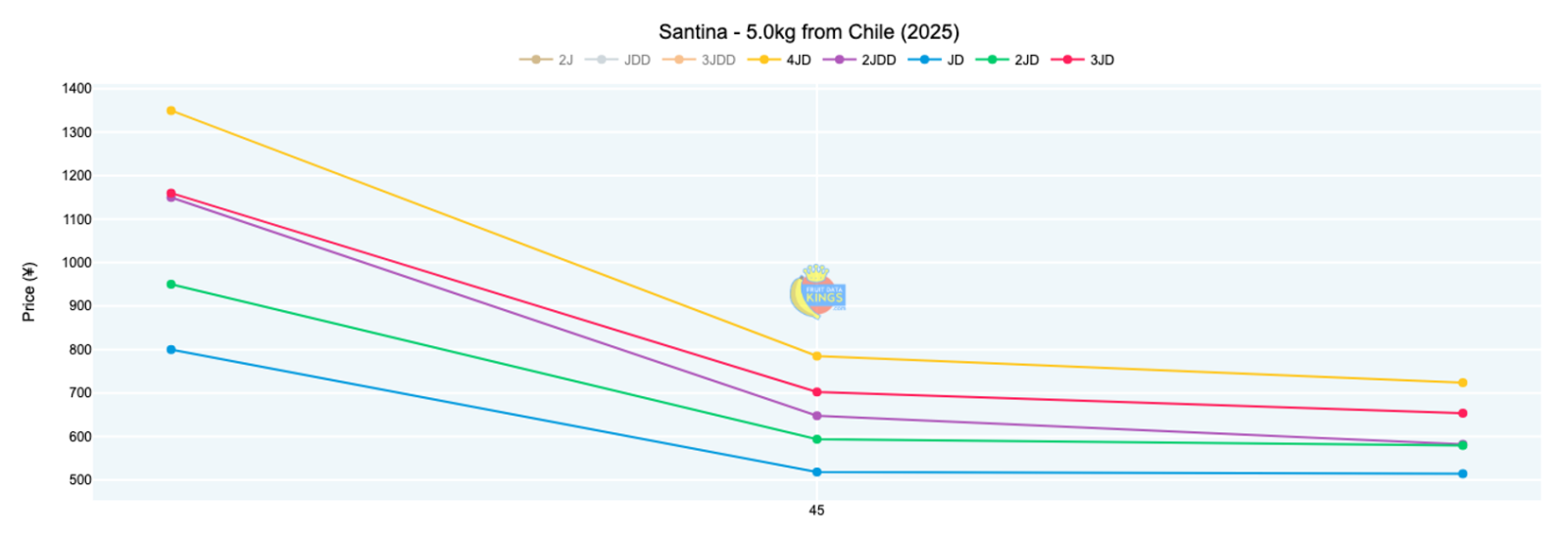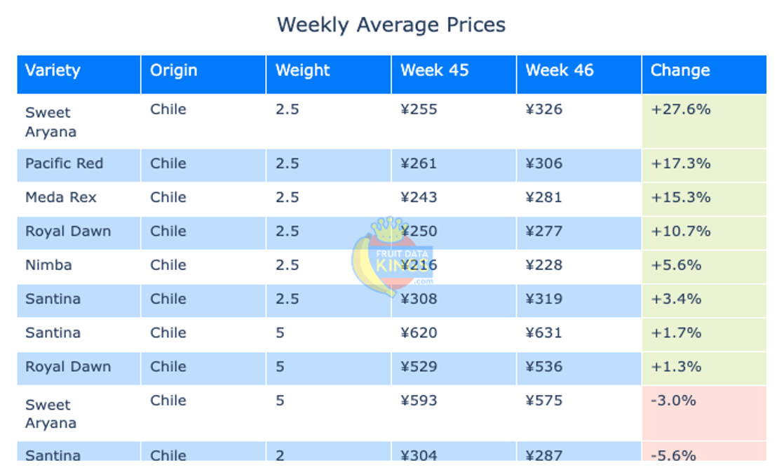 We are glad to report that the market remained steady and lifted somewhat during week 46. The percentage of Santina available in the market increased further with over 70% of our data showing the Santina variety. At present, Santina is trading at an average value of ¥630 (5 kg, various sizes), which is 10% lower than the same week of 2024 and 30% lower than that of 2023. Members can find full Guangzhou and Shanghai wholesale pricing, as well as retail pricing for AEON, Walmart, Wumart, 7Fresh, Vanguard and more, online. View market data.