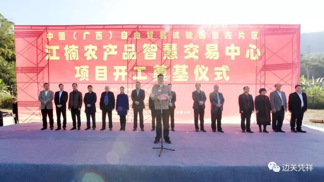 On Dec. 6, an official ceremony was held in Chongzuo to celebrate the laying of the foundation of the Jiangnan Agricultural Products Smart Trading Center. The smart trading center is an investment by Guangzhou’s Jiangnan Fruit and Vegetable Wholesale Market Co. Ltd., with the ceremony coming shortly after the formal announcement of the establishment of the Chongzuo section of the China (Guangxi) Experimental Free Trade Zone. The ceremony was officiated by Wang Fanghong, Pingxiang city’s party secretary and general director of the management committee of the Pingxiang Integrated Free Trade Zone. The ceremony’s special guests included the mayor of Pingxiang, Wu Xiaohui, and other senior officials from the city. Meanwhile, Ye Canjiang, chairman of Guangzhou Jiangnan Fruit and Vegetable Wholesale Market Co. Ltd., represented the company at the event.