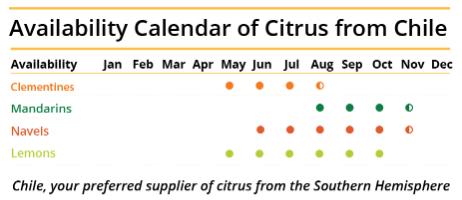 Chile is the one-stop shop for everything fresh, offering more than 30 different species of fresh fruit, including lemons, clementines, mandarins, oranges and grapefruits, all of which are characterized by their distinctive color, flavor, firmness and aroma and available from May through November.