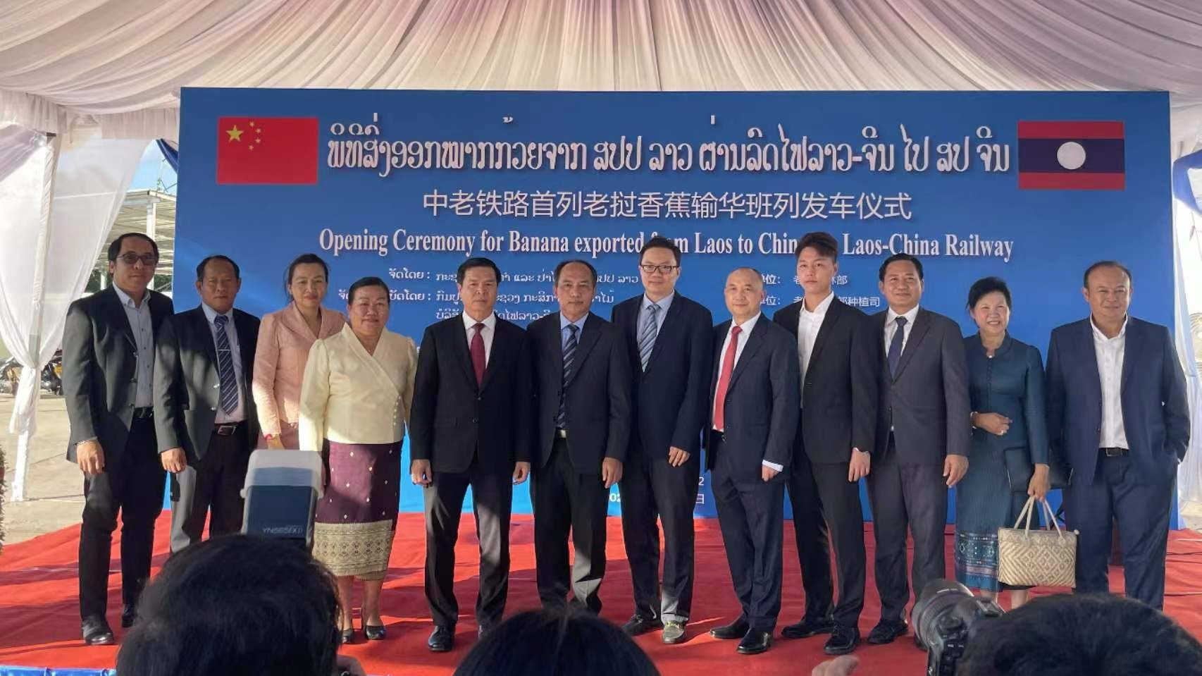 Prior to the special banana train, the first fresh fruit shipment employing the China–Laos railway set out from Vientiane on Nov. 30 and arrived at Mohan Railway Port on Dec. 3. That shipment was comprised of 25 train carriages loaded with 351 metric tons of Laotian bananas, 154 metric tons of Thai longans and 35 metric tons of Thai durians.