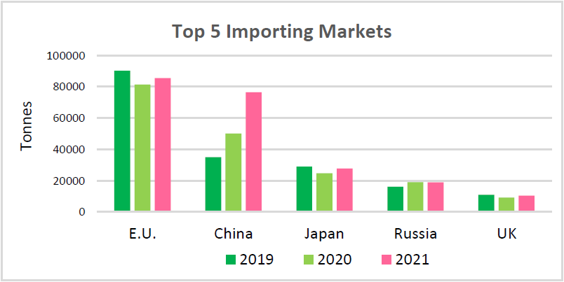 The top five export markets for Southern African grapefruit are the European Union, China, Japan, Russia and the United Kingdom. Among these, the European Union is still the biggest importer of Southern African grapefruit with an import volume of approximately 85,000 metric tons in 2021. The China market has seen the most growth in recent years, with imports increasing from 50,000 tons in 2020 to 76,000 tons in 2021, a year-on-year increase of 52%. This rapid growth is mainly attributable to the higher proportion of PP-grade grapefruit being exported to China. Japan ranked third at 28,000 tons, just ahead of Russia’s 19,000 tons. Finally, the United Kingdom ranked fifth at 10,000 tons.