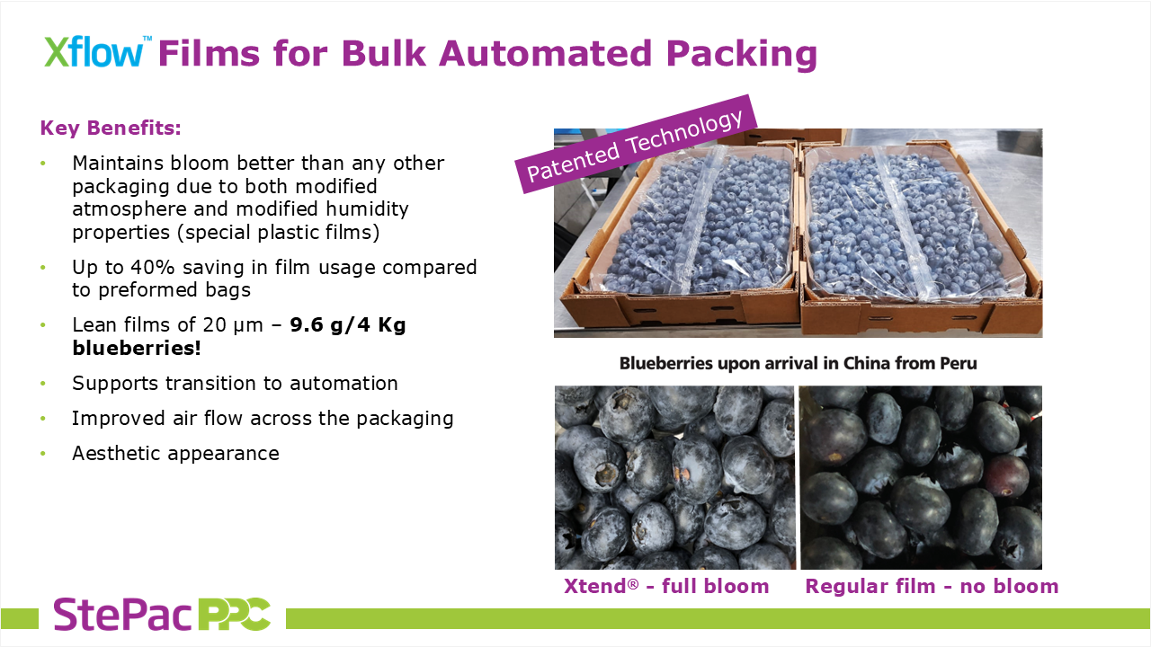 The webinar next moved from theory to tangible results, highlighting transformative improvements across key produce items. For blueberries, MAP combined with StePacPPC’s automated formats such as Xflow preserves natural bloom and quality for over 45 days while reducing plastic film use by 40%. In the case of broccoli, Xtend, StePacPPC’s modified atmosphere and humidity solution, eliminates the industry’s reliance on ice-filled polystyrene boxes, freeing up as much as 66% more container space per shipment. For cherries, StePacPPC’s MAP-based solutions double the shelf life to 4–6 weeks, making the 25-day sea journey from Chile to China commercially viable while maintaining stem freshness and firmness. Grapes also benefit: the Xtend solution extends the season for premium varieties such as Shine Muscat, preserving marketable quality for up to five months.