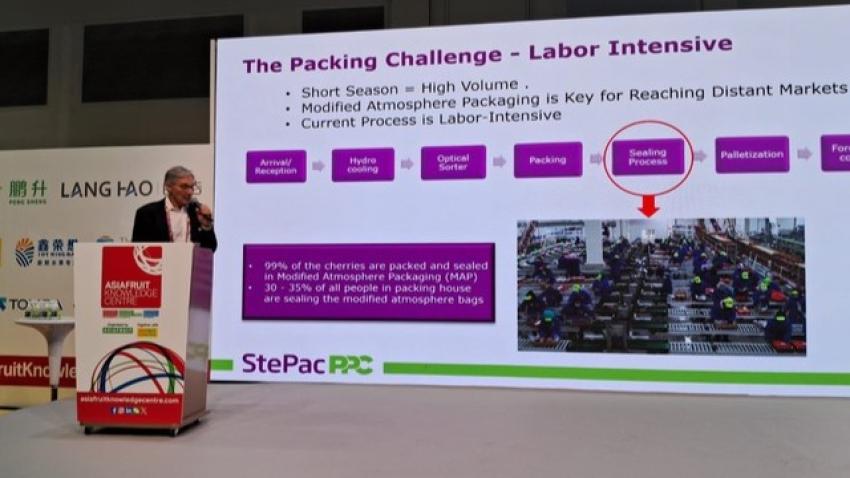 Using the cherry industry as an example, Tunchel outlined the challenges faced by Chilean exporters. Currently, up to 99% of Chilean cherries bound for China are packed using modified atmosphere packaging. This is a labor-intensive process in which 30–35% of packing plant staff seal bags manually, a practice that is increasingly difficult to sustain amid rising labor costs, creating a clear need for automation.